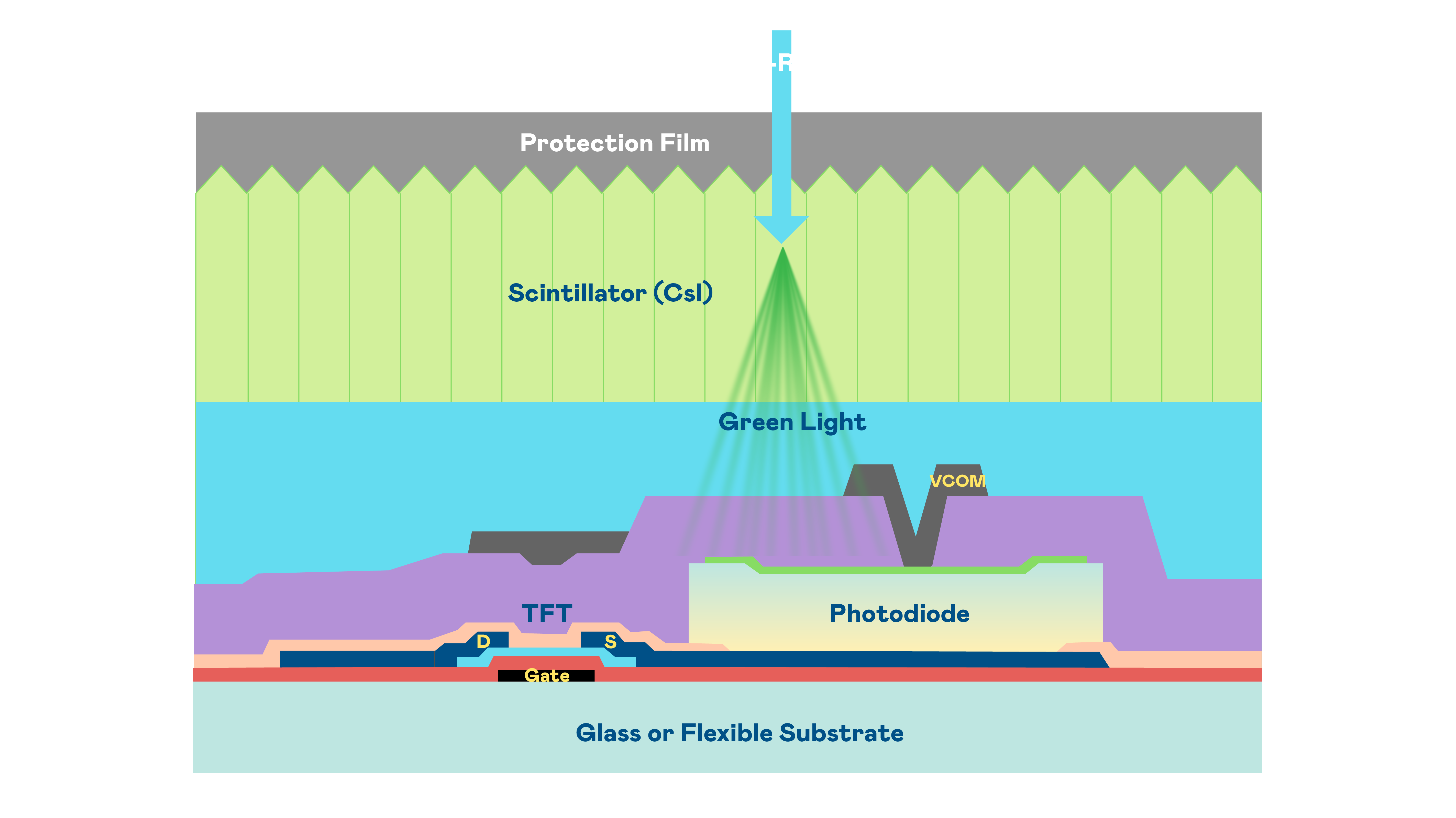 CA88的X光影像感测阵列使用薄膜电晶体 (TFT) 作为每个像素的读取开关,搭配光电二极体(Photodiode)的光电转换元件,用以感测X光影像讯号。